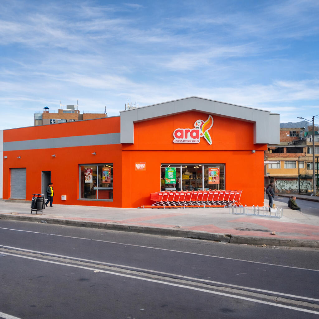 Remodelación simultánea de siete fachadas de Tiendas ARA, en Bucaramanga y Piedecuesta, ejecutada en ocho días calendario, cumpliendo cronograma previo a visita directiva corporativa.